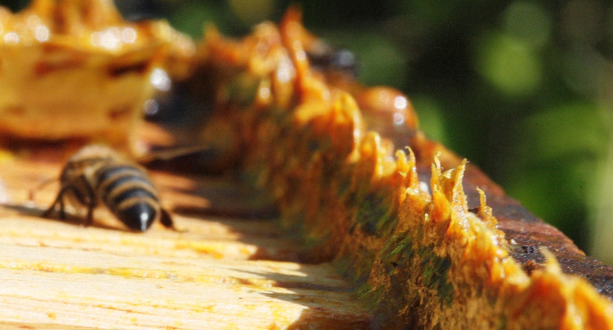 Bijen verzamelen hars van bomen en planten en mengen dit met enzymen, stuifmeel en was om propolis te produceren.